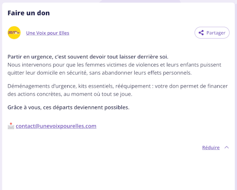 Votre don permet de financer des déménagements d’urgence, la livraison de kits de première nécessité et l’équipement de nouveaux logements pour les femmes victimes de violences et leurs enfants. Chaque contribution nous aide à intervenir rapidement et à lever les freins matériels qui empêchent de partir. Les dons sont collectés de manière sécurisée via HelloAsso, plateforme dédiée aux associations.